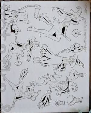 Размер: 190х150х1мм. Размер элементов: странница с лошадкой - 6 см, самая большая подруга на метле - 10,5 см, пузырёк малыш - 1,1 см.